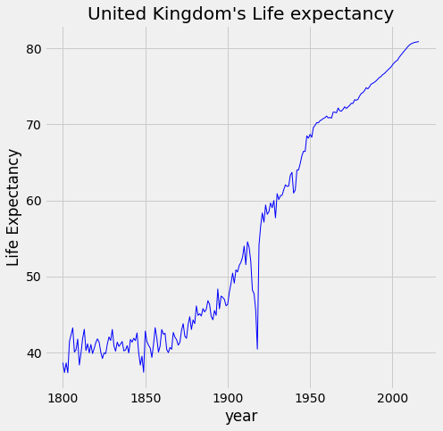 print(df) country=df['entity'].unique() for i in country: dta=df[["life_expectancy","year"]][df['entity']==i] plt.figure(figsize=(7,7)) plt.plot(dta['year'], dta['life_expectancy'], color='b', linewidth=1) plt.title(f"{i}'s Life expectancy") plt.xlabel('year') plt.ylabel('Life Expectancy') plt.show() print('\n')